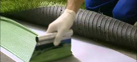 Убедитесь, что основание под приклеивание искусственных газонов отвечает необходимым требованиям. Смешайте два компонента из упаковки. Тщательно перемешайте двухкомпонентный клей до однородной массы. Перелейте в чистую емкость и снова перемешайте. Разложите рулоны искусственной травы. Отогните искусственный газон в области швов. Подложите полоску пленки из полиэтилена, сверху положите шовную ленту U 849. Нанесите клей на ленту. В течение 50 минут уложите материал на клей. |