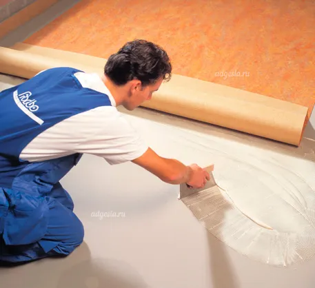 Перемешайте раствор клея в ведре до получения полностью однородного состава. Клей наносите на всю поверхность фактурным шпателем имеющим зубцы. Нанесение клея таким шпателем позволит образовать из клея рифы, которые после укладки покрытия зайдут друг на друга, что позволит избежать пустот под покрытием и равномерно распределит весь клей. После укладки покрытие аккуратно притрите покрытие. При использовании одностороннего приклеивания, время подсыхания составит до 20 минут.