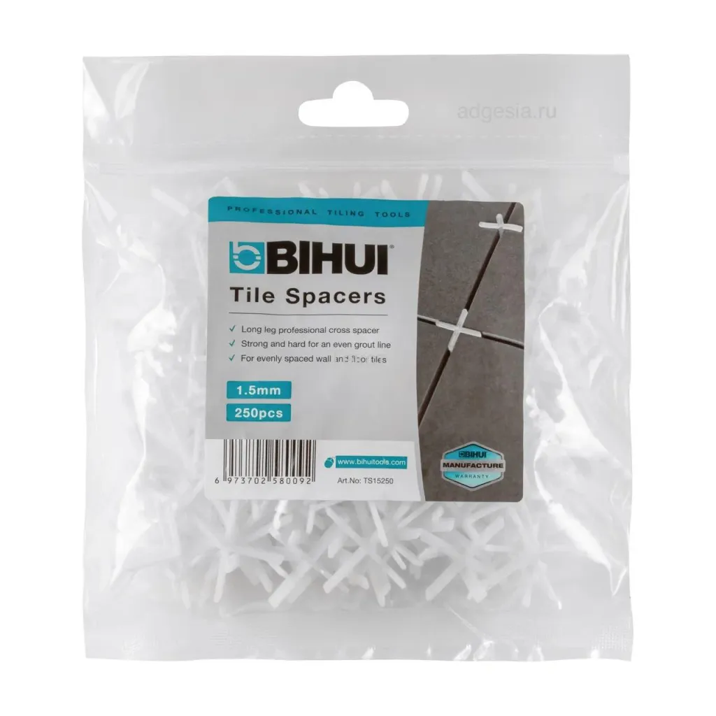 Крестообразные расшивки BIHUI не имеют сколов или заусениц. Подходят для плитки любого типа. Массивная структура крестиков повышает устойчивость к изгибу и раздавливанию, что делает их идеальными для работы с крупноформатной плиткой. Нижняя часть крестиков разработана специально для лучшего прилегания к раствору.