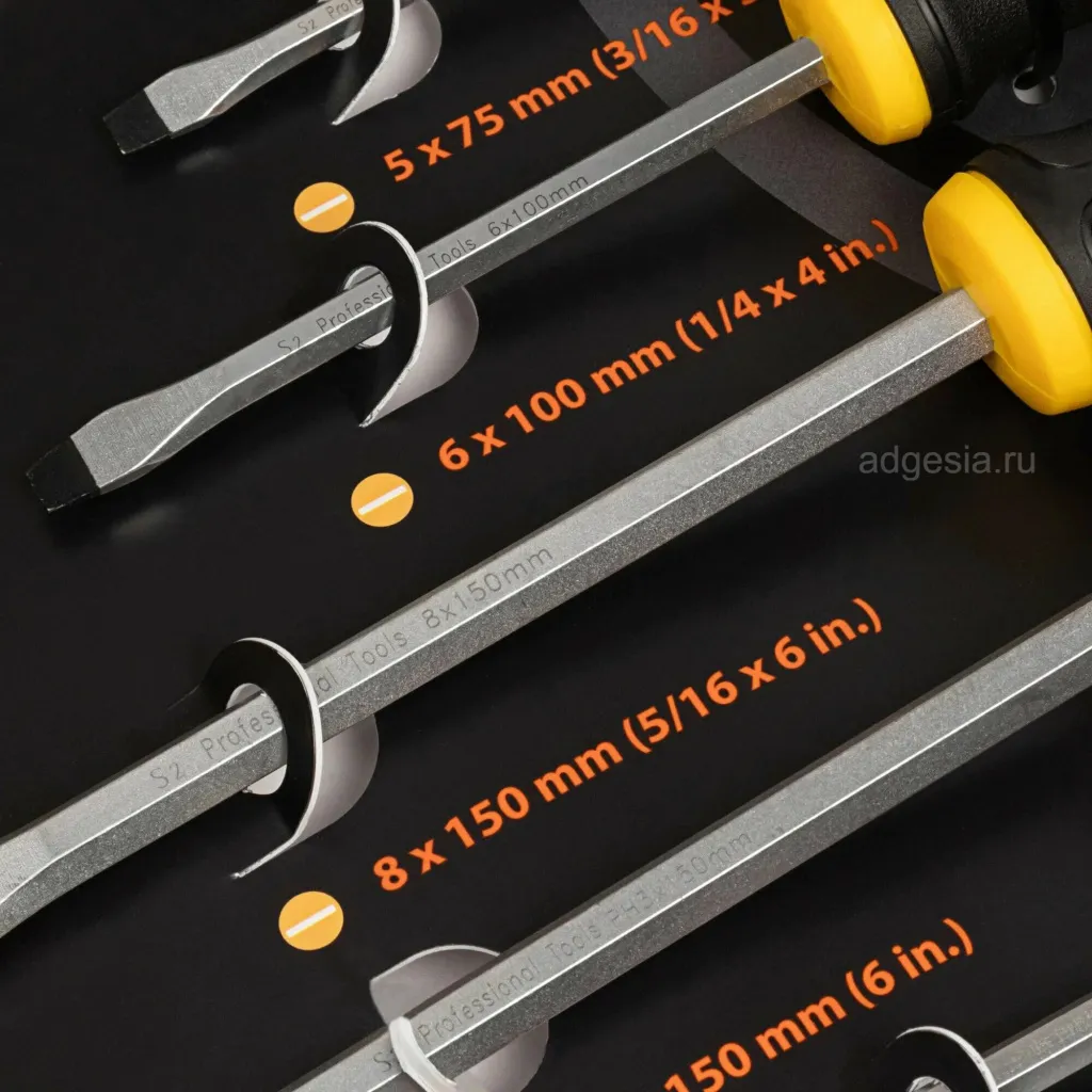 Набор из шести отвёрток Tactix серии PRO+ предназначен для закручивания и откручивания крепёжных деталей. Отвертки имеют конструкцию сквозной установки стержня со стальным затыльником. Стержни инструментов сделаны из стали S2, что придаёт им особую прочность, износостойкость и долгий срок службы.