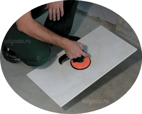 При отделочных работах часто возникает необходимость перемещать отделочные материалы. Для безопасной переноски такого отделочно материала, как, керамогранит, керамическая плитка, стекло, металл и пр. используйте присоску Rubi.