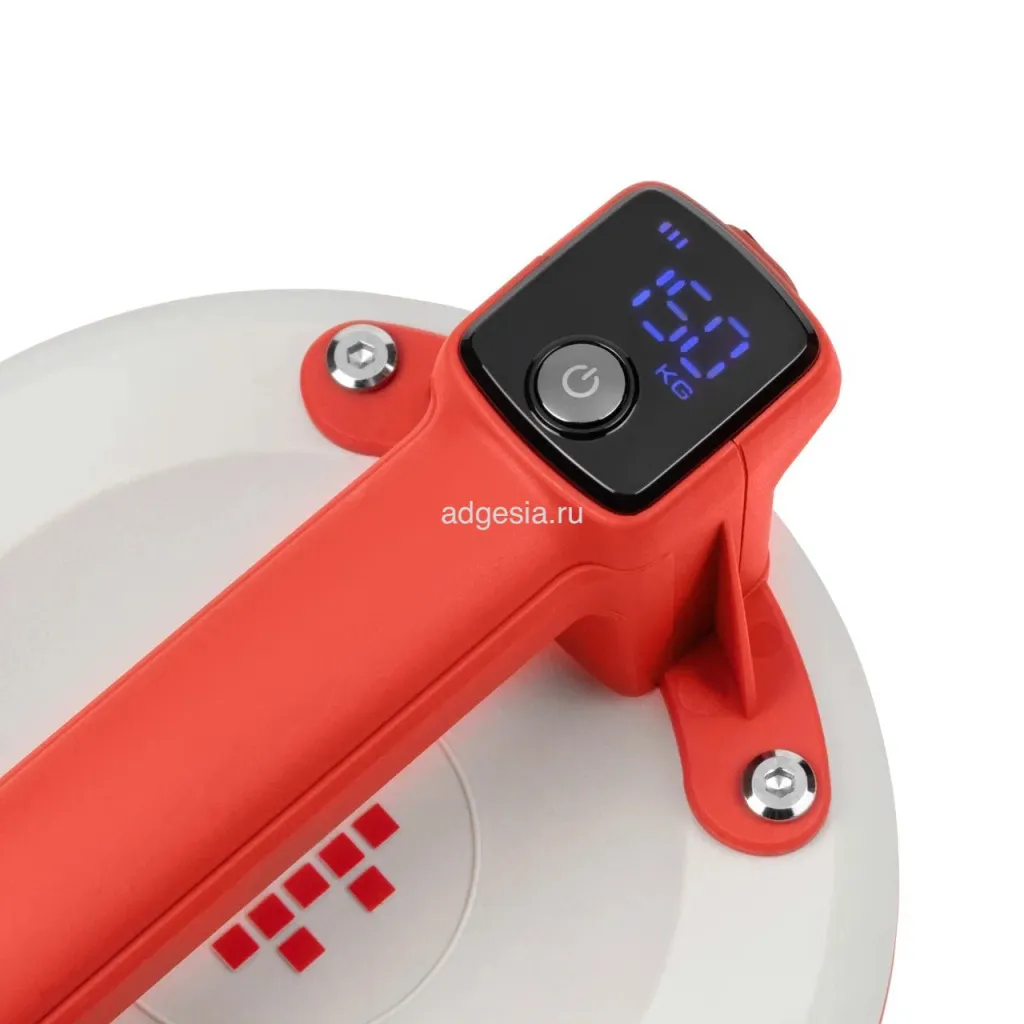 Модель оснащена встроенным электрическим насосом, датчиком давления и дисплеем для контроля уровня заряда батареи и массы удержания. Датчик автоматически включает насос для восстановления необходимого уровня вакуума, обеспечивая эффективную работу. Присоска может удерживать грузы до 150 кг на отрыв и до 100 кг на соскальзывание.