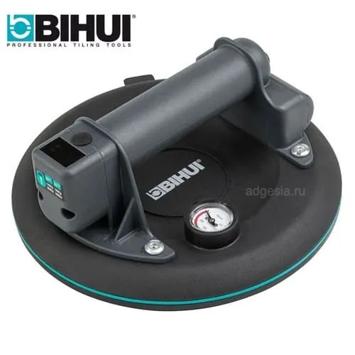 Присоска Bihui используется для работы с крупноформатной плиткой большого веса. Применяется для рельефной, шероховатой или гладкой плитки. Данный инструмент оснащен электро насосом, монаметром, датчиком давления, а также имеет дисплей. Датчик позволяет контролировать силу разрежения воздуха, и когда необходимо восстановить корректные параметры автоматической подкачки (вакуума), автоматически выключает насос.