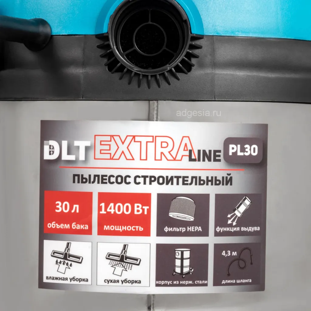 DLT EXTRALINE PL30 — предназначен для сухой и влажной уборки и оснащён поплавковой системой защиты от переполнения.
