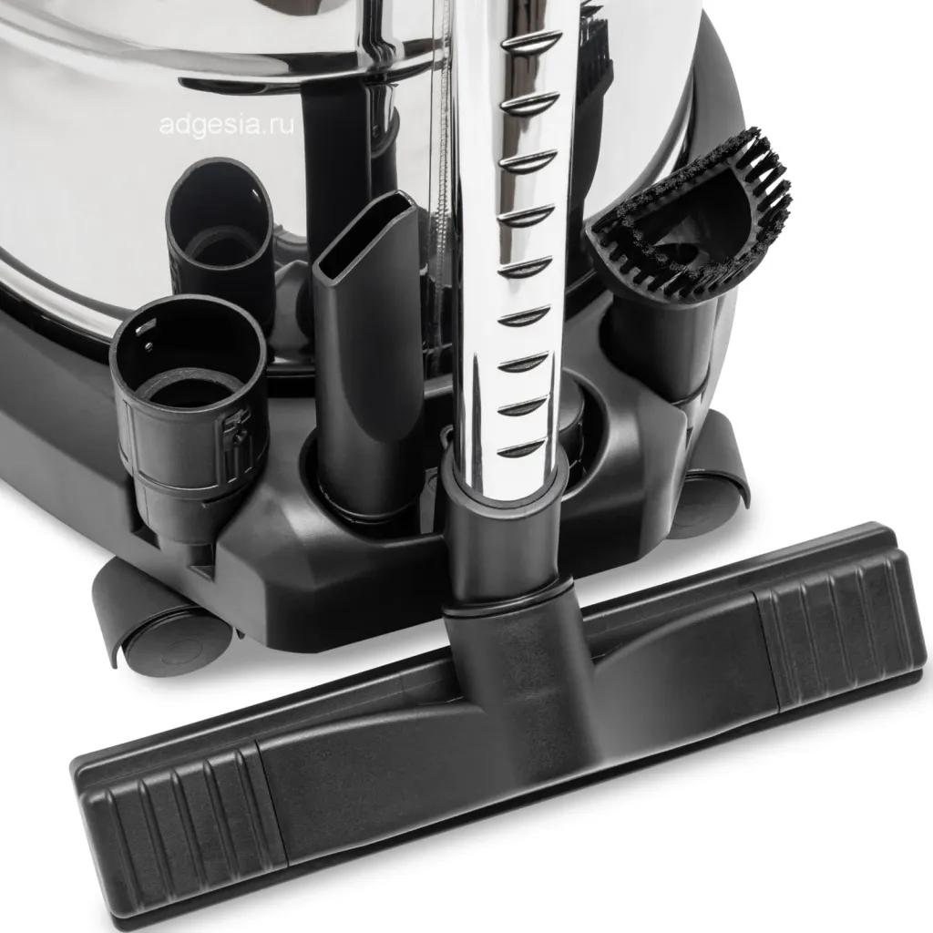 Комплектация пылесоса включает в себя: 2 фильтра (для сухой и для влажной уборки), шланг 4,3 м, сетевой кабель 7 м, металлическую нержавеющую телескопическую трубку, накопительный бак из нержавеющей стали, щелевую насадку, насаадку для уборки пола, переходник для электрооборудования. Длинный кабель и шланг позволяют работать в более просторных помещениях.
