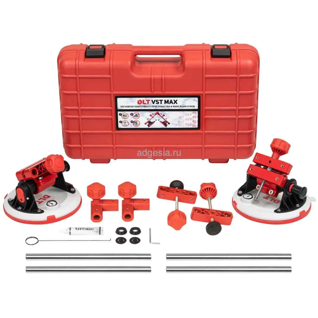 Система фиксации углов и регулировки плиточного пространства DLT VST MAX — это многофункциональное устройство 2 в 1. Она представляет собой струбцину с помповыми присосками, предназначенную для стягивания плит и выравнивания швов между ними как по горизонтали, так и по вертикали. Также система используется для фиксации внешних и внутренних углов. Идеально подходит для работы с крупноформатным керамогранитом, натуральным и искусственным камнем, керамикой, стеклом, пластмассовыми панелями и кварцевым агломератом. Применение этой системы позволяет значительно повысить эффективность монтажа.