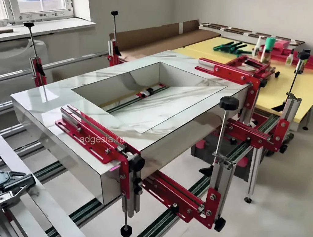 Универсальная струбцина «Диамант» для надежной фиксации элементов из керамогранита, натурального камня и других материалов. Обеспечивает прочное удержание двух плоских деталей под углом 90° во время монтажа, подгонки и отверждения клея.