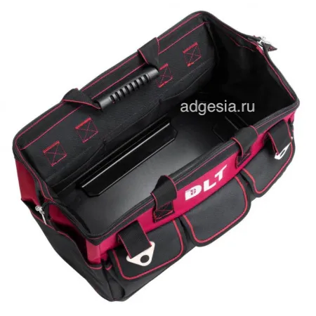 Сумка DLT оснащена прошитыми ручками с уплотнителями внутри для удобства переноски. Надежная, крупная молния позволяет широко открывать сумку по всей длине для удобства доступа. В лицевой части вставлен металлический каркас, благодарая которому сумка держи форму в раскрытом состоянии. Дно сумки для инструмента укреплено гибкой пластиковой вставкой.
